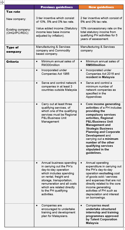 The Malaysian Investment Development Authority (MIDA) has recently released a guidelines on Principal Hub (PH) 2.0 which set out the enhancements for the existing PH incentives. The new guidelines will be effective for applications received by MIDA from 1 January 2019 until 31 December 2020. The main changes from the previous guidelines are as follows: