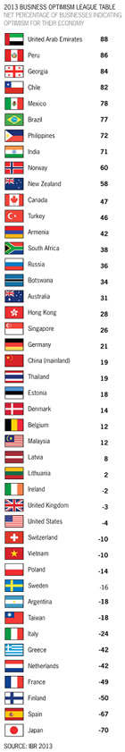 By comparison, optimism in North America swung from 6% in Q4 2011 to 52% in Q2 2012, before falling back to just 1% in Q4 2012. The G7 economies have seen similar swings, while European businesses have reported a slow decline in business optimism.