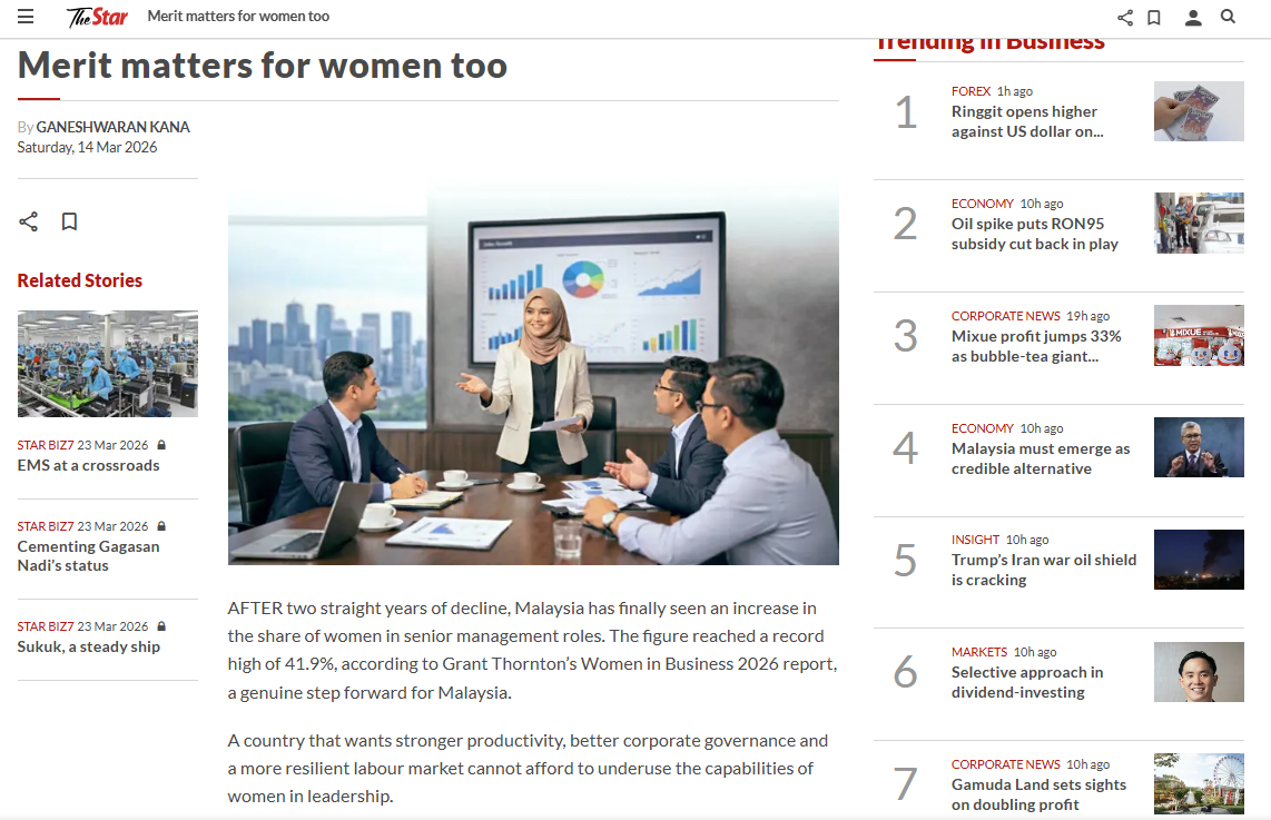 AFTER two straight years of decline, Malaysia has finally seen an increase in the share of women in senior management roles. The figure reached a record high of 41.9%, according to Grant Thornton’s Women in Business 2026 report, a genuine step forward for Malaysia.